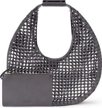 STAUD s iconic tote made from woven leather features a 70s-inspired circular shape that resembles a crescent moon. A structured profile, removable wallet and spacious interior provide easy storage.