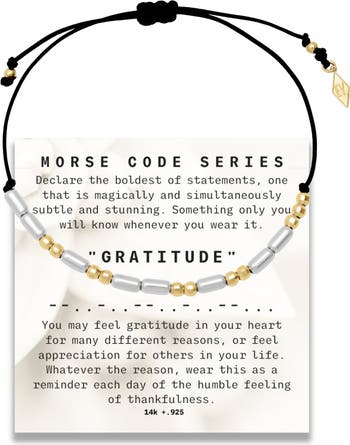 Make a quiet, bold statement with this meaningful Morse Code bracelet on an adjustable black cord with faceted 14k gold beads and rhodium dipped sterling silver beads. | Choose between various words that resonate with you and what you value. | A portion of each sale is donated to one of ELLIOT YOUNG s impact partners that support childhood youth crises programs. Bracelet features include adjustability and a signature logo tag | Includes a presentation card displaying the actual Morse code pattern and word meaning | Packaged in a logo gift pouch, ready for gifting or personal wear | Perfect for stacking with other styles in the series or wearing on its own | Made in the USA