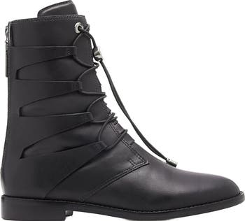 Leather motorcycle boot with adjustable stretch laces and back zipper. A unique and elevated take on this classic boot is brought to life with leather cut-outs that are adjustable to any leg width and comfortably hold your foot and ankle. Memory foam insole to pad every step with a modern and roomy toe box. Boots can be adjusted for a form fitting look around the ankle to go over jeans and pants, with skirts and dresses or, loosen the laces for a more relaxed look. We got major Kate Moss vibes, which is where this beauty got her name.