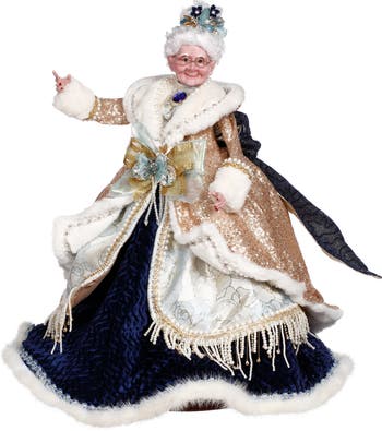 Mrs. Claus arrives at the holiday ball in lavish elegance, adorned in an opulent gown embellished with sparkling jewels and festive trims. Her graceful pose and radiant smile capture the magic of Christmas gatherings, blending sophistication with seasonal cheer. With Mark Roberts’ signature craftsmanship and attention to detail, she becomes a breathtaking centerpiece that elevates any holiday display.