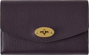 A gleaming postman s turnlock closure puts the polish on a sleek grained leather wallet featuring a perfectly organized interior.