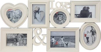 Capture the good memories with your loved one and showcase it in this creamy white collage photo frame. This wall decoration not only displays your beautiful photos but also acts as a stunning decor. Change your abode into something trendy using this wall fixture. Product Features: Off-White collage frame Features the word "Love" and an ampersand sign "&" Frames are shaped of hearts, oval circles, round circles, 3 horizontal rectangles and 1 vertical rectangle Collage can hold: one 4" x 4", two 5" x 3", one 3" x 3", two 3" x 5" and one 4" x 6" photos Includes hanging hardware Recommended for indoor decorative use only Dimensions: 14.25"H x 26.5"W X 1"D Material(s): plastic