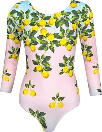 Multicolor Lemon Print Long Sleeve One-Piece Rashguard Swimsuit, Little Kid-Big Kid