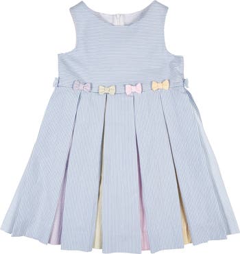 Fresh and cheerful, this dress combines classic blue and white stripe seersucker with playful pleats and bows in multicolor check seersucker. Crafted from 100% cotton, it’s lightweight, breathable, and perfect for warm-weather outings. The waist dress silhouette and pleated skirt create a timeless shape, while a back invisible zipper keeps the look polished and easy to wear. Falling at the knee, it’s ideal for vacations, spring celebrations, and sunny days spent outdoors.