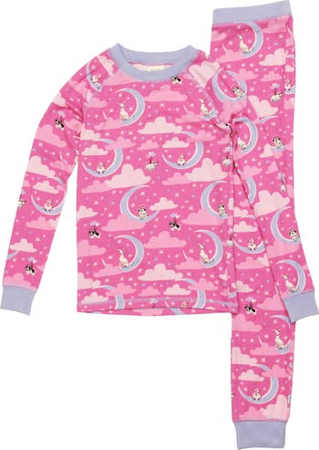 Moon dogs—sun dog s nocturnal cousins—have a howlin good time on these kid-sized pajamas made from soft, stretchy and breathable jersey.