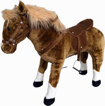 MUSIC STANDING PLUSH HORSE - Gallop into a world of imagination with our Standing Plush Horse for Kids! Crafted with high-quality materials and designed for endless enjoyment, this beautiful plush horse offers a secure and cozy playtime companion for your little equestrian. This horse is sure to become a beloved and trustry companion on your child s adventures! Its charming design and lifelike features ignite creativity, transporting kids to a world of the Wild West, riding the range, or leading a royal parade. A delightful sound feature brings the riding experience to life with a real horse sound, captivating young minds and enhancing sensory play. The horse is crafted in a realistic color palette of brown with white stockings and golden mane, and comes complete with a suede-textured saddle, bridle, and stirrups to provide an authentic riding play experience for your child. The sturdy construction ensures stability, making it a safe and reliable friend on on their riding jouneys. Your little one will develop essential skills while having the time of their life. Give kids the gift of timeless fun with our Standing Plush Horse – where every moment is an adventure waiting to unfold. STURDY CONSTRUCTION: Designed for stability with sturdy construction to hold up to enthusiastic play, so parents can enjoy peace of mind while their child enjoys hours of fun and imaginative play with their plush companion.