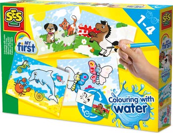 SES CREATIVE: MY FIRST COLORING WITH WATER - Introduce your little one to the magic of painting—without the mess! The SES Creative My First Coloring With Water set is the perfect way for toddlers to explore their creativity in a fun, safe, and easy way. Easy to use - Just dip the special brush in water, paint over the cards, and watch the hidden colors appear like magic! No paint, no stains—just pure creative fun. Designed for tiny hands, the included safe brush has secure bristles that won’t fall out, making it perfect for little artists. Even better, once the card dries, the colors disappear, so kids can paint again and again for endless entertainment. Perfect for ages 1-4, this reusable, no-mess art activity helps develop fine motor skills, color recognition, and hand-eye coordination, all while keeping parents happy. Just add water and let the creativity flow. Comes with a child-safe brush and four illustrated cards showcasing a variety of animals for hours of creative play. Perfect for storytelling and introducing colors in a fun, engaging way.