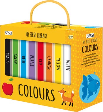 SASSI: MY FIRST LIBRARY - COLORS - This wonderful set of 8 sturdy board books is designed to introduce young children to the exciting world of colors. Through charming illustrations and delightful rhyming stories, this set helps children recognize primary colors, secondary colors, and the basics of black and white. Each book is thoughtfully created to captivate young readers while teaching them essential color concepts in a fun and interactive way. The colorful imagery and playful text make learning enjoyable, fostering a love for discovery and creativity. Perfectly sized for little hands, these durable books are ideal for independent exploration or shared reading with parents and caregivers. The compact and portable design ensures that learning can happen anytime and anywhere, whether at home or on the go. This well-rounded library is not only a fantastic tool for teaching children about colors but also a valuable resource for parents and educators seeking to make early education enjoyable and meaningful. Measuring 3.15" x 4.72" (8 x 12 cm) with 8 pages per book and stored neatly in a box measuring 8.66" x 3.15" x 6.9" (22 x 8 x 17.5 cm), this set is ideal for toddlers and young children aged 2 and up. By combining reading with playful exploration, this collection makes learning about colors simple, fun, and unforgettable, sparking curiosity and building foundational knowledge in a delightful way. INCLUDES: Storage box that holds 8 mini board books.