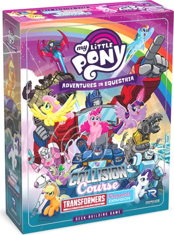 MY LITTLE PONY DECK-BUILDING GAME COLLISION COURSE A TRANSFORMERS CROSSOVER EXPANSION - The Transformers have come to Equestria! A Fusion of Friendship! The skies of Ponyville have opened up, and we find our heroines’ home hijacked by the unlikeliest of new friends and nasty foes: the Autobots and Decepticons of Cybertron! Travel around both Equestria and Cybertron to find everything you need to build a powerful deck! This expansion requires the My Little Pony: Adventures in Equestria Deck-Building Game. Ages 14 and up. 1 to 4 players. 45-90 minute playing time.