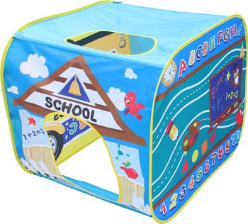 Fun s in session with the School House Play Tent! Adorable graphics provide themes of an indoor and outdoor classroom, and a school bus that encourage creative role play and imaginative thinking. This lightweight play tent sets up in a snap and can be used anywhere for indoor or outdoor fun.