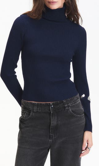 A breathable knit softens the rib stitches of this turtleneck sweater with a slim fit that layers well or looks great on its own.
