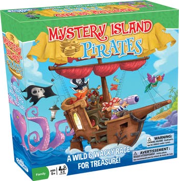MYSTERY ISLAND PIRATES is a back-and-forth race from Pirate s Cove to Treasure Island, where anything can happen. Choose your boat, roll the dice, and head off on the high seas for a wild adventure. The player who does the best pirate impression goes first. This tile-based game is always different as the path taken is never the same. Lay the game tiles out from the start tile to the finish tile any way you choose. Players will discover as they land on the tiles and turn them over that lucky parrots will flap you forward, while crocodiles, ghost ships, and a giant octopus will set you back. Some tiles require you to do nothing. Be the first pirate to navigate the winding sea route and reach the final Treasure Island tile, while in possession of the Treasure Chest game piece. But, watch out as the Treasure Chest game piece can be stolen by another player Mystery Island Pirates is a game with high play value and excitement for all the mateys. Features high quality wooden tokens and thick durable island tiles, made with linen paper and bright colors. Designed for 2 to 6 players, ages 5 and up.