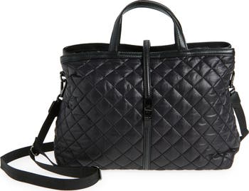 Gleaming logo hardware and diamond-quilted nylon distinguish a wear-anywhere bag fitted with dual compartments and a removable zip pouch for optimal organization. A multitude of straps offer versatile carrying options.