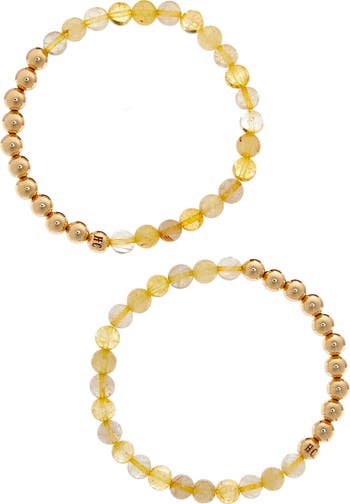 Seek good fortune with this pair of stretch bracelets showcasing a carefully selected mix of crystals, polished stones and 14k-gold-plated beads.