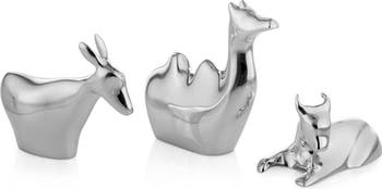 Celebrate the Christmas season with an elegant nativity set featuring a polished cow, camel and donkey.