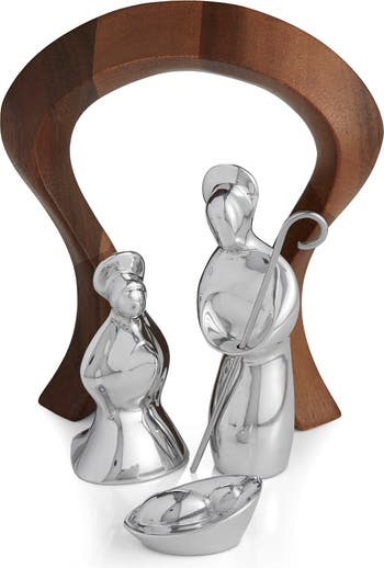 Celebrate the Christmas season with an elegant nativity set featuring polished, minimalist figures and a richly grained acacia-wood arch.