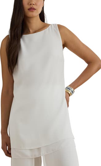 A floaty layered hem creates dimension on this longline sleeveless top made with an elegant bateau neck.