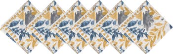 - Each napkin measures 20" x 20". Leafy sprigs with delicate buds and subtly blooming flowers paint a lively yellow, blue, and indigo scene on a fresh white ground. This item includes 6 napkins which feature turned seams. Each napkin measures 20 x 20 inches, similar to the size of a bandana. The coordinating placemats and table runner are available separately. Crafted of 100-percent cotton