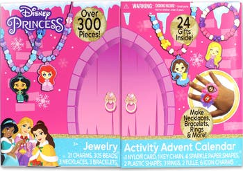 Discover the magic of the holidays with the Disney Princess Necklace Advent Calendar! Kids can countdown to Christmas with all their favorite Disney Princesses! Calendar comes with 12 Princess Charms, beads, necklace cords, bracelet cords, and rings. Each day will hold a special component that you can collect and then make necklaces, bracelets and rings. Open a new window each day to reveal your surprise! The perfect gift for the Holidays. Ages 3+.