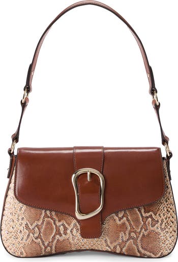 A sculptural buckle inspired by modern art brings a hint of gleam to this retro shoulder bag crafted in a curved silhouette from a mix of python-embossed and smooth leather.