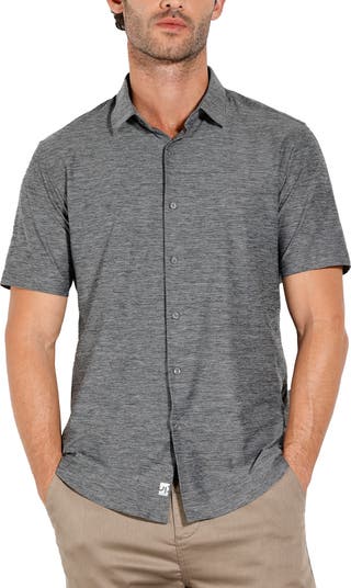 Classic short sleeve shirt in a soft nylon-spandex blend. Features button front and a refined melange texture.
