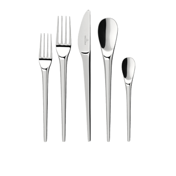 Villeroy Bochs New Moon cutlery adds a modern flair to every table setting. 18/10 stainless steel provides superior rust resistance and a lustorous shine that never needs polishing. The 5 piece place setting includes one each: Dinner fork, Salad/ Dessert fork, Dinner Knife, Soup Spoon and Teaspoon. Dishwasher safe.