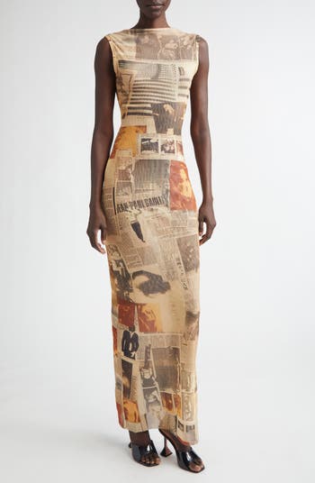 JPG rewrites the rules of branding with this figure-flaunting mesh dress patterned in newspaper clips celebrating the iconoclastic designer s extra, extra! career. The deeply dipped back turns every exit into a headline moment.