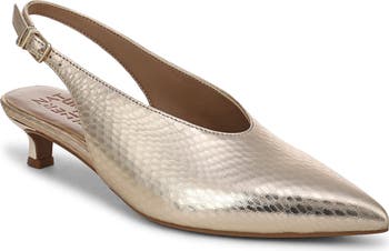 A high-cut topline and pointy toe bring sharp angles and dimension to a metallic leather pump set on a cushioned footbed and kitten heel.