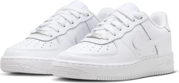 The basketball shoe that started a sensation keeps on shooting and scoring as a sneaker reissued for smaller feet that want to kick around in bigger style. The iconic Air Force 1 sole sports embedded Nike Air cushioning and crenellations along the tread that frame a star-studded bumper toe.