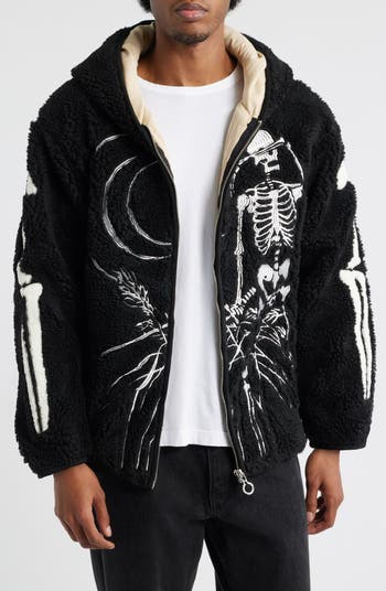 Spark conversation and turn your OOTD into a walking work of art with the intriguing embroidered pattern of this plush fleece hoodie.