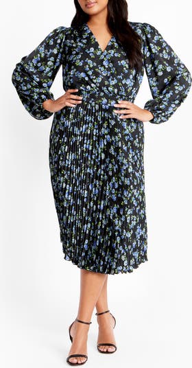 Dainty florals enliven this long-sleeve satin midi dress framed by a classic V-neckline and softly pleated skirt.