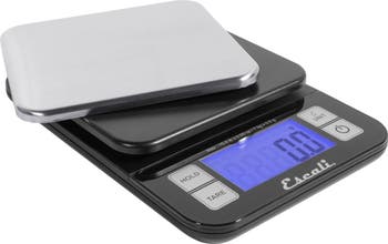 The NSF certified Escali Nutro Digital Scale features a large easy-to-read back-light display, touch sensitive controls and a raised stainless steel platform that is dishwasher safe. Use the Display Hold function to hold measurements on display when weighing oversized items, and use the Tare function to clear the weight of a container or multiple items on the scale. Three AAA batteries included.