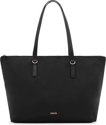 Gleaming hardware and textured faux leather stand out against the durable nylon exterior of a spacious shopper bag designed with multiple compartments for easy organization.