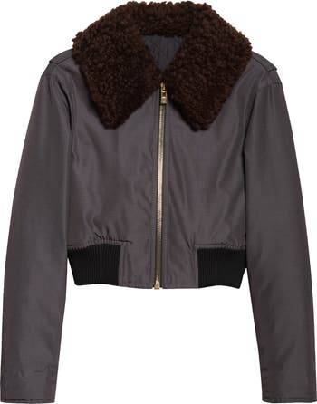 A collar of plush genuine shearling brings a luxurious element to this wool-enriched bomber jacket made in a cropped silhouette with rib trim and zip cuffs.
