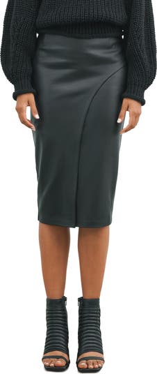 A front slit creates definition on a faux-leather midi skirt that offers a unique yet edgy statement to your night-out ensemble.