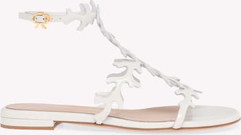Ocean Flat ist eine Römersandale mit runder Zehenpartie, lasergeschnittenem Korallenmotiv und einem 10 mm flachen Absatz. Sie ist aus Nuit gefertigt, dem charakteristischen weichen Glanzleder des Hauses. Den Knöchelriemen ziert die legendäre Ribbon-Schnalle. Handgefertigt in Italien.