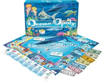 There s something fishy about Ocean-Opoly. It s all the fun of a large-scale aquarium without having to set it up or clean it. This game features all kinds of ocean life with details about each one on the backs of the deeds. You ll swim around the board as a crab, fish, shark fin, lobster, starfish, or seahorse. Collect your blocks of water and turn them in for the big fish to collect the most sand dollars and win the game. For 2 to 6 players.