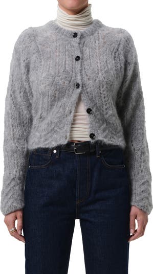 A supersoft fuzzy-knit texture amps up the cozy-cool vibe of this lightweight cardigan you can layer or style solo.