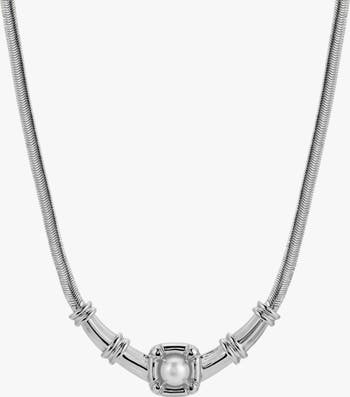 A striking puffy snake necklace with a gracefully graduated design leading to a bold centerpiece. The pendant features a smooth, rounded square with subtle grooves at its corners and delicate embedded stripes. At its heart, a natural round freshwater pearl
