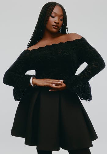 Feel irresistibly romantic in this off-shoulder lace top adorned with flounced sleeves. The fitted silhouette, scalloped neckline, and stretch lace fabric exude confidence and charm.
