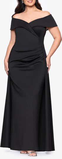 Turn heads whenever you grace the room in this flowy scuba gown featuring a fold-over neckline that falls off the shoulder and pleats that softly shape the floor-length skirt.