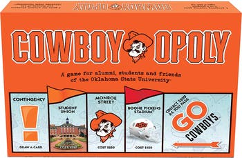 Oklahoma State Cowboys Cowboyopoly Monopoly Game makes great gifts for your favorite college fan or graduate. The makers of this game visited campuses across the country and designed a unique game for each. There s nothing like college memories. Just like the regular monopoly, but with actual names and places from each school. The tokens or game pieces included are: alarm clock, pencil, gym shoe, bicycle and graduation cap. Great fun for the whole family.