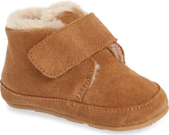 Water-resistant suede and superfluffy faux-shearling lining keep tiny toes snug and warm in this dapper little hook-and-loop bootie.