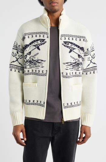 A rugged look for the river or the lodge, this zip-up sweater is knit with a hint of cozy wool and bold intarsia fish designs inspired by 1950s fly fishermen.