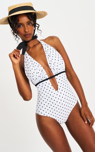 Make a splash this summer in the Olive Swimsuit, where vintage charm meets modern chic. Designed with a flattering ruched bust and a classic white base adorned with black polka dots, this halter-neck, backless style ties elegantly at the back for an adjustable fit. Crafted from stretchy elastane fabric and fully lined for comfort and coverage, it s the perfect piece for sun-soaked vacations and poolside lounging. Style it solo or pair it with the Raffaella Cotton Denim Straight Leg Pants for an effortlessly cool, beach-to-street look.