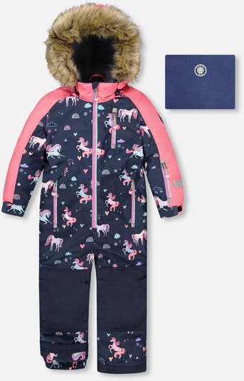 Every moment on the mountain is warmer and drier with our one-piece PLAY ski suit in navy unicorn print. Designed for maximum comfort and improved performance, this snowsuit features articulated knees and sleeves, adjustable hems and sleeves to accommodate growing kids, a detachable hood, and Cordura-reinforced panels for long-lasting durability. Elastic cuffs, snow guards, a wind flap, and a chin guard keep the elements out, while a waterproof coating and dirt-repellent finish keep little skiers and snowboarders clean and dry.