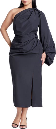 A dramatic sleeve and a gathered waistline drape enhance the wow-factor of this shoulder-baring maxi cut from crisp poplin.