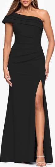 Be a verdant vision of elegant loveliness in a one-shoulder gown slashed with a side slit and shaped with gathered ruching.