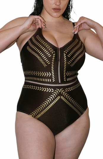 Handmade fitted one piece with delicate gold detail. Made with a high-quality, double-layered Italian Lycra fabric. Gold detail on suit may fade or peel slightly when exposed to chlorine after long time use.