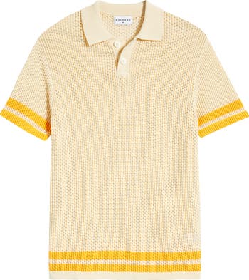 This breezy polo steps up its game with an open-knit design and a smart stripe pattern at the sleeves and hem.